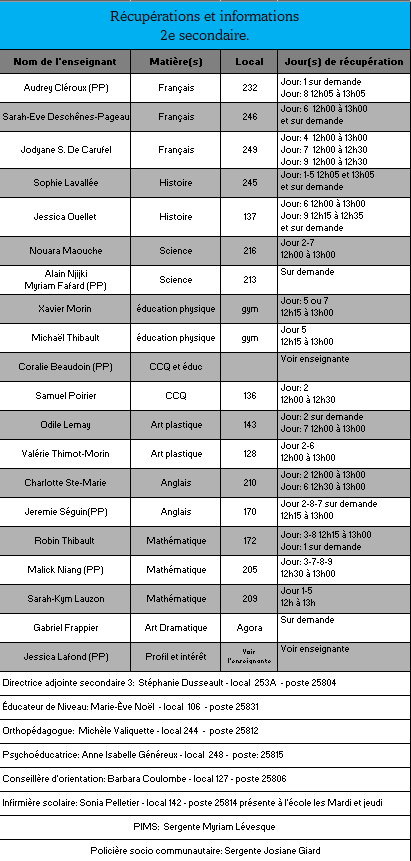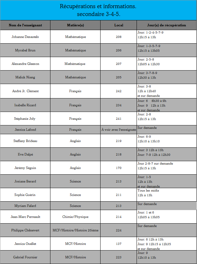 Voici les tableaux des récupérations offertes par les enseignants. Si vous désirez télécharger un ou des tableaux en particulier, les liens sont en bas de cette page.